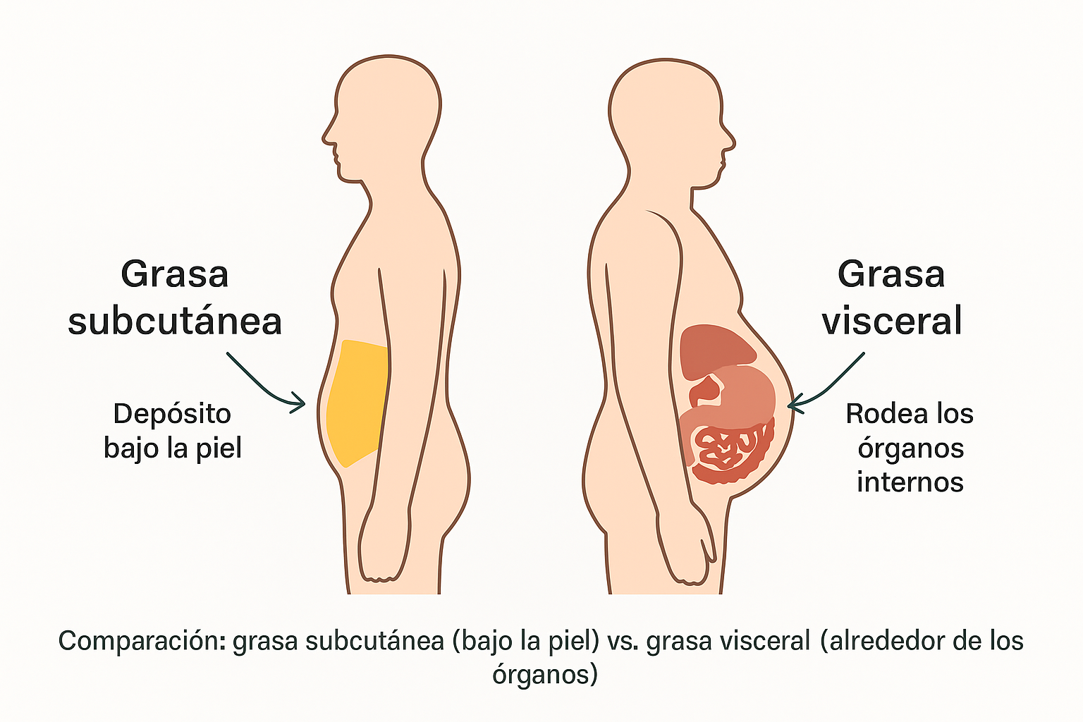 La grasa corporal se encuentra presente en nuestro cuerpo como grasa subcutánea y grasa visceral. La primera se encuentra debajo de la piel y la segunda rodea los órganos, siendo esta última la más perjudicial. Abajo podemos ver imágenes de referencia de porcentaje de grasa corporal para estimar nuestra condición. Existen varios métodos de medición, desde los más simples hasta los más sofisticados, y en mi experiencia he utilizado bioimpedancia manual y de balanza para comparar resultados.